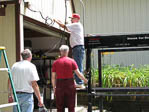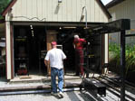 Harry Tabor and Ron Trenhaile took to the task of supporting the power cable to the transfer table by first adding a mast to support the cable overhead. They then strung a horizontal cable just above the door opening to support the coiled power cable. |