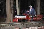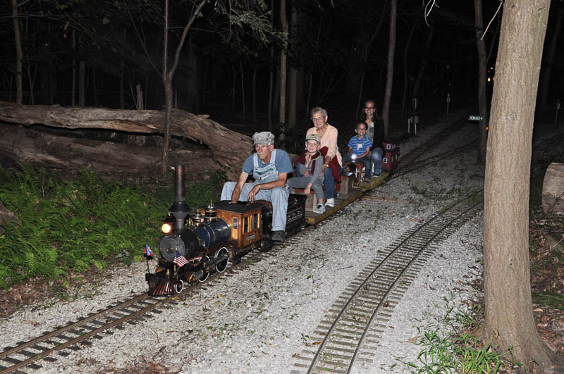 John Koontz was the next to come by with the Park engine and a full load of passengers as they head for Pandora and the Covered Bridge. Mike running the Camelback is at the end of the bridge with a smiling load of riders at he makes his way into the darkness of the night. |