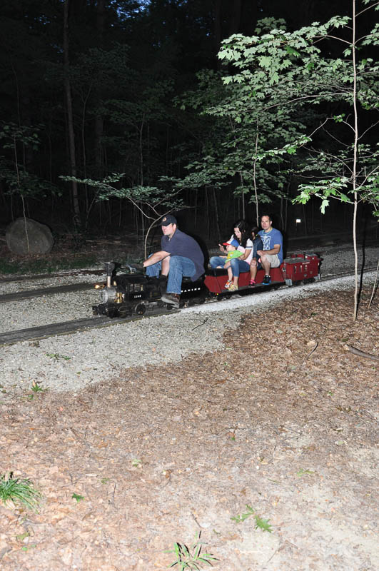 Ron passes by my location with passengers that are obviously enjoying the night ride. This photo definitely proves there is a crossing as Bob passes over it with the clickity-clack of the wheels over the gaps in the rails for the crossing. |