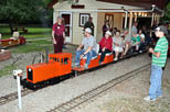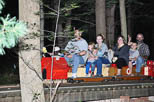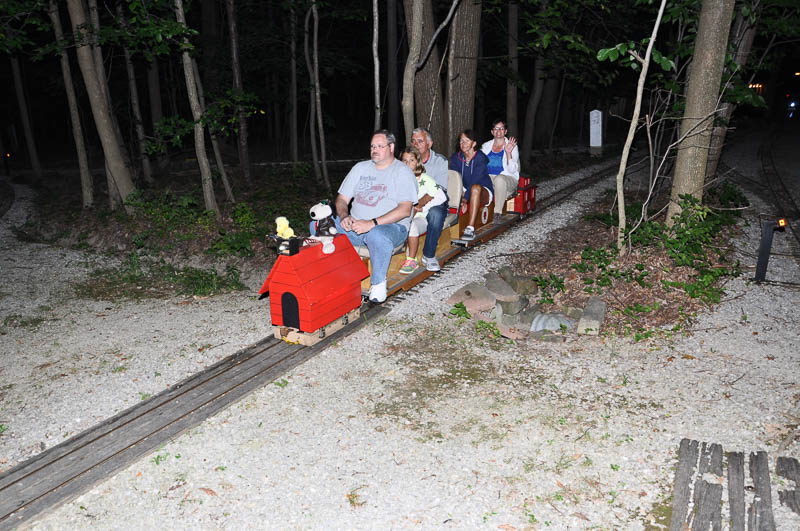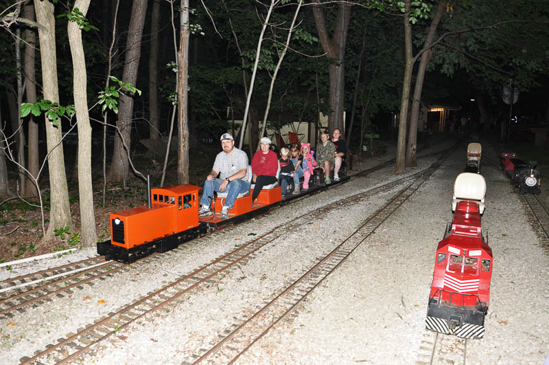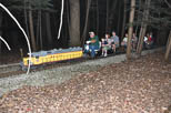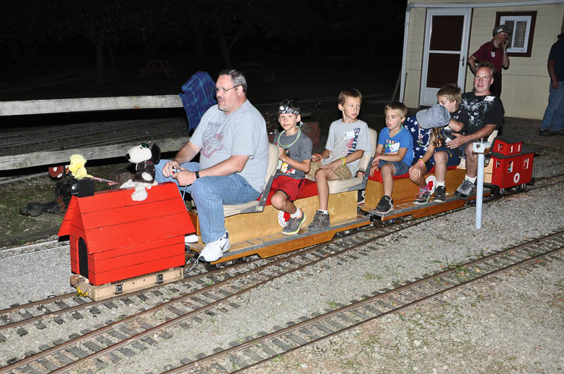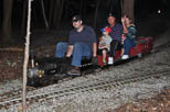 Bob and Donna Craig, with his scratch-built diesel engine, talks with Ron Trenhaile before departing Shriver Station with their riders as Josh Frank watches. Paul Zorko leaving the station with his passengers for his first run of our Super Star Party night run. |