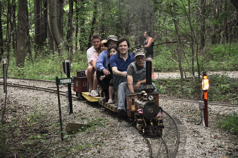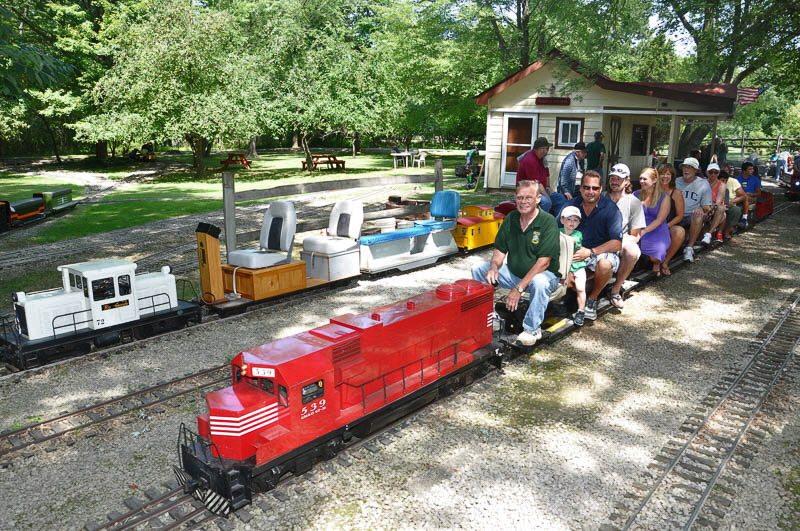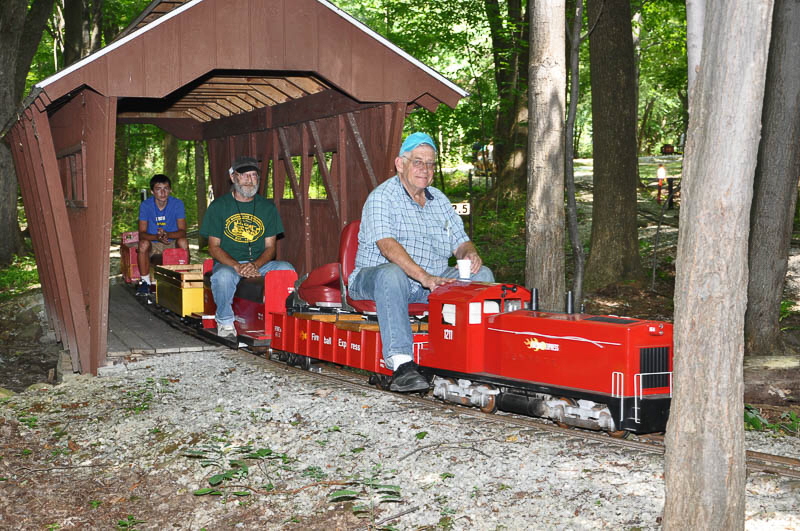 John Koontz with the Park engine has just arrived back at the station after his run and Jen waits for the train to stop to assist with unloading. Paul Emch running the Fire Ball Express with Dave Woldman and Logan riding behind as they do the shake down run before hauling passengers. |