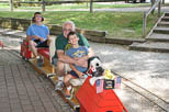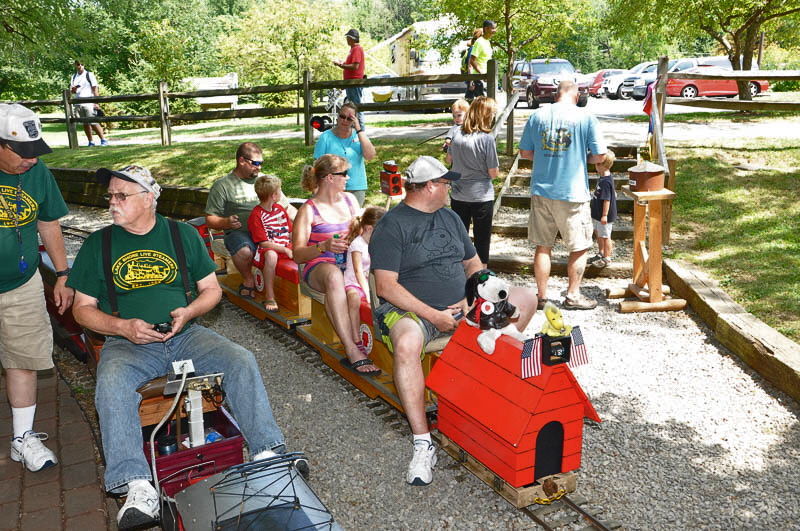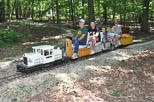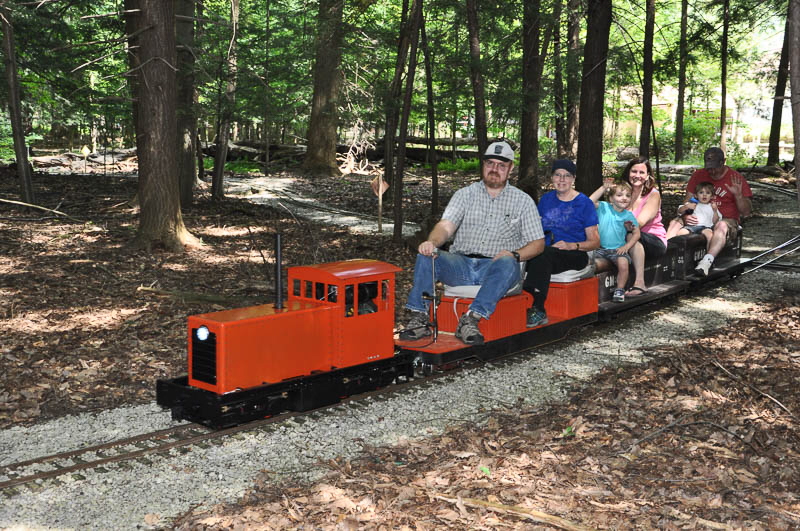 Austin Tapolyai at the rear as Bill gives his grandson, Ethan a hug before they start off down the mainline with the Snoopy train. Amy Deptowicz watches as Logan prepares to leave the siding with his friend Sam Imhoff. |