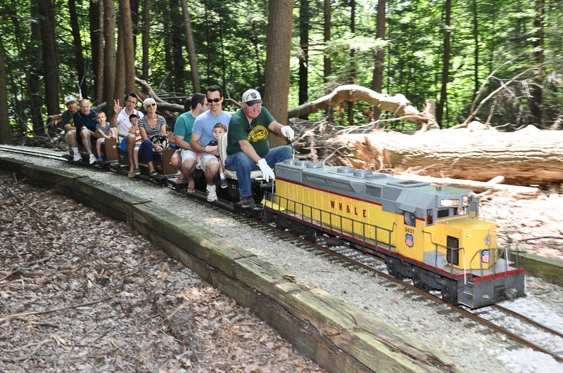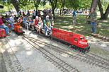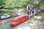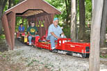 Dick with his SW1500 at the same location as he heads for Shoe and the half way point of the ride. Bill came by next with the Snoopy train and his passengers as he heads for Shoe and the Covered Bridge. |