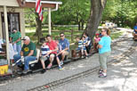 Dave Hird talks to Ken Brooks at the station as John Deptowicz rolls to a stop to unload his train with the aide of Jen Zorko. Harry Tabor, as engineer of the GP38, departs with a full complement of passengers with Logan as his conductor. |