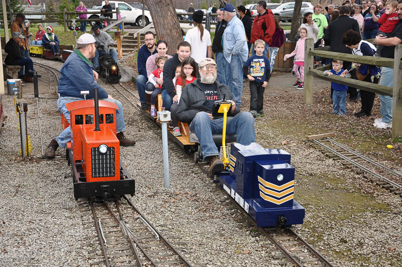 Bob Craig with his diesel powered switcher is loaded with passengers and slowly gains speed as he departs Shriver Station. Ron Malinowski will soon be back at the station with his passengers as he nears the end of his first run. |