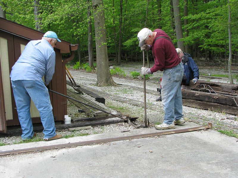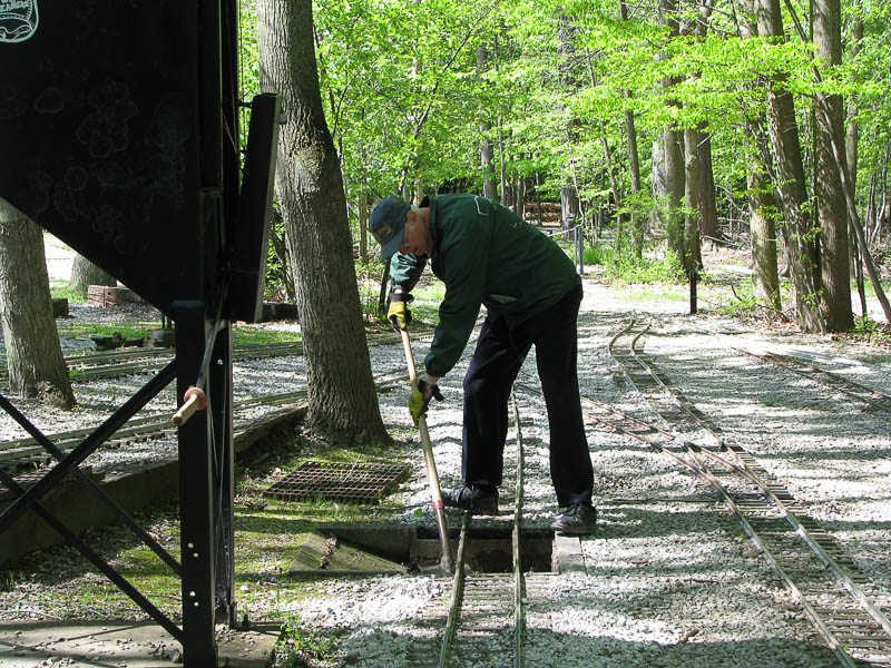 Judson Elliott was applying oil to the various switch throws to keep them lubricated and prevent them from binding up. Paul Emch was doing some weed wacking around the tranfer table and the small turntable. |