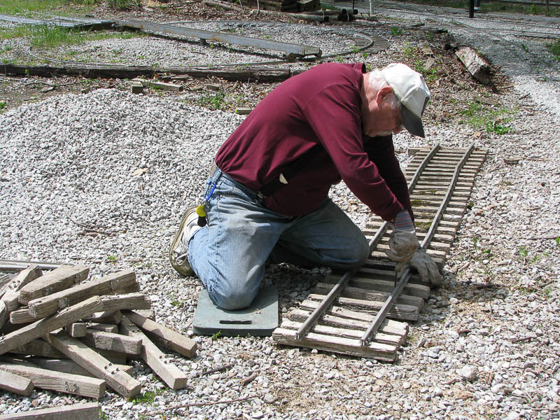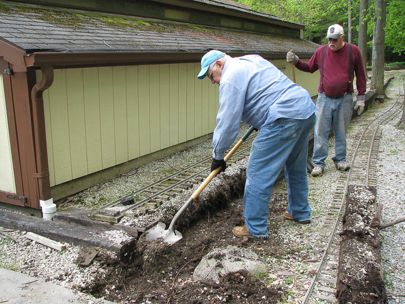 At Drudgery, Steve Zaken was cleaning out the leaves and debri from the ends of the drainage culverts using rakes and shovels. Ken Brooks worked on removing the damaged rail from the ties so they could be reused at another location. |