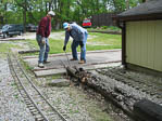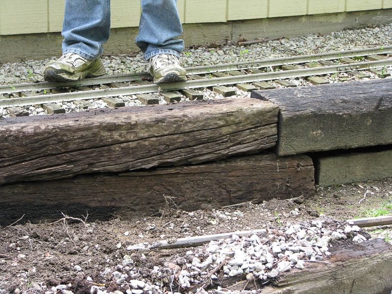 The project for the track crew today will be to repair this grade wall alongside of the Willis Car Barn. The existing railroad tie has rotted out pretty badly on the underside and collapsed, needing to be replaced. |