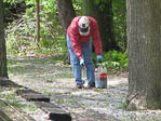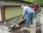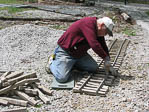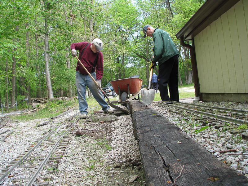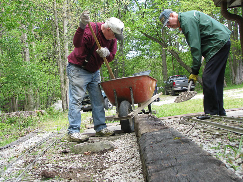 Ken got a wheelborrow of ballast and he and Ron spread it on both sides of the newly placed ties after they were spiked together. A second wheelborrow of ballast was needed to backfill around the ties. |