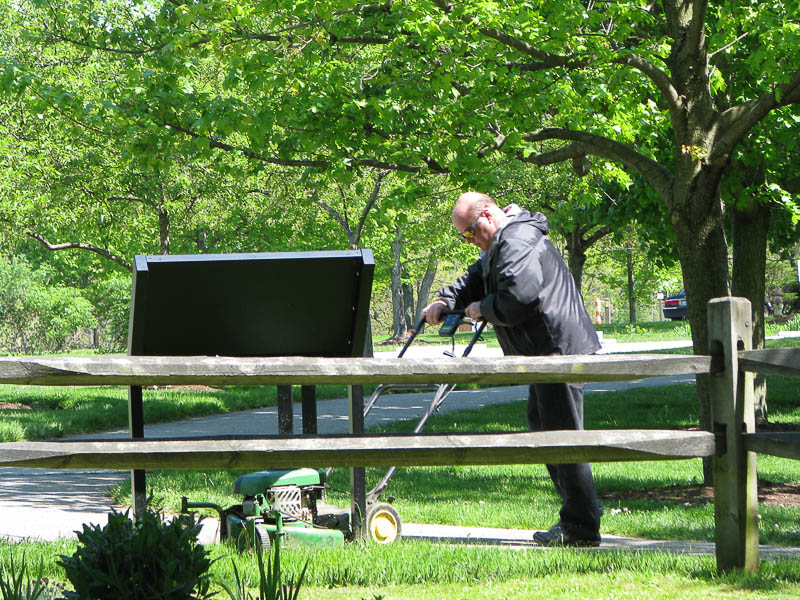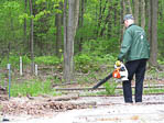 Ron was using a leaf blower to remove debri from the yard tracks in the area where a tree service took down a old tree that was dying. Ken was picking up pieces of the tree limbs that were too large for the blower to handle. |