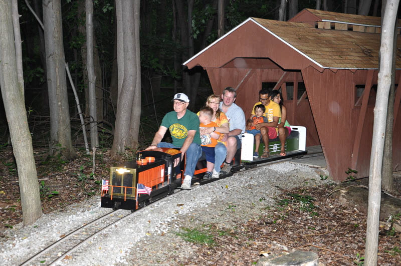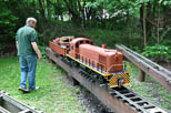 The next to depart the station with his passengers riding behind his Reading Railrod switcher was Ken Vendlinger. As the sky darkens with a possible impending rain Scott gives a wave as he starts his next run. |