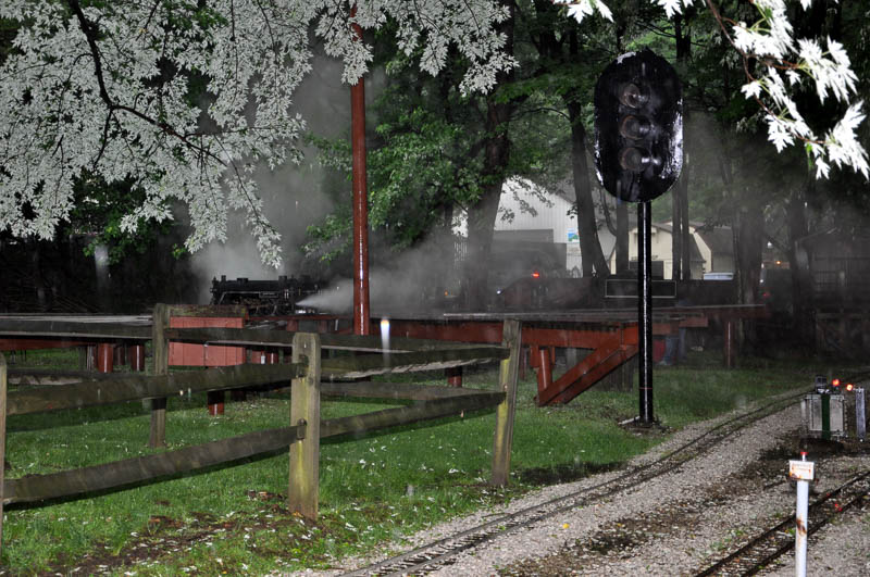 Dave Woldman shows his newly purchased RS-3 minus the cowling and cab as it sits by the coaling tower. This is mid afternoon but it looks like evening as Scott departs Horrendous heading for Zip Junction with his riders. |