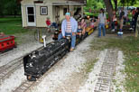 On mainline track No. 1, Frank Smoley with his train and Ron Malinowski behind with his train wait for Paul Emch to depart Shriver Station with his passengers. Frank with his switcher pulling away from the station with his passengers. |
