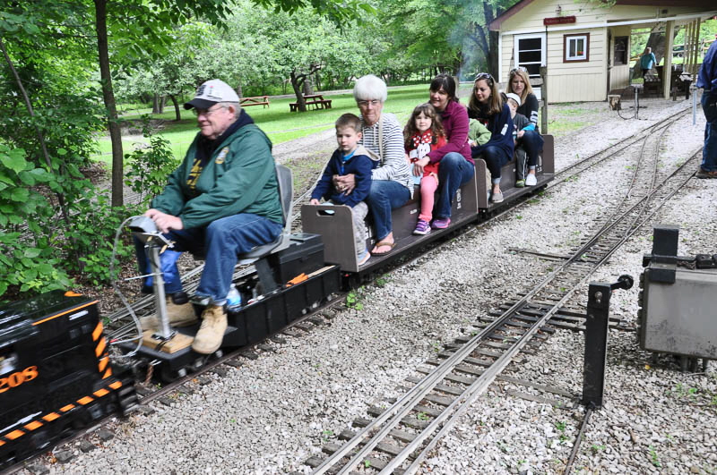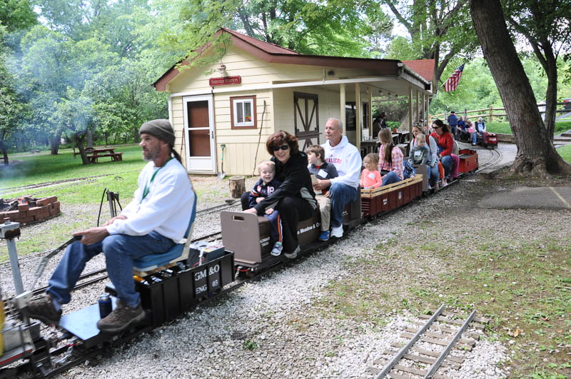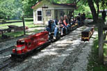 Scott departing with his passengers as he passes the steaming bays at the start of his run. Ken in front of Shriver Station as he waits for the remaining riders that haven't ridden yet to board his train. |