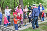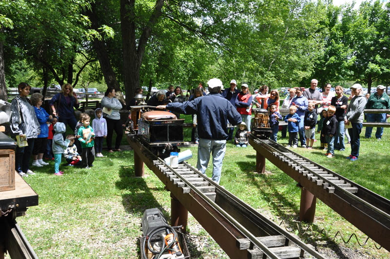 Judson is showing the youngsters some railroad cars that we didn't have on display in 1/8 scale and quizzed the kids as to what they thought that the cars would carry. Here Judson is showing them one that has a snow plow attached. |