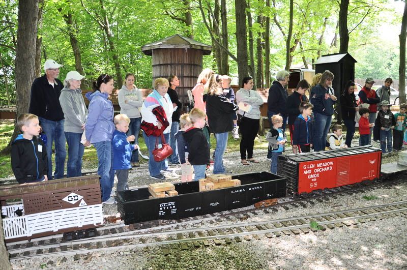 Judson describing the log car and how it would transport the logs to the saw mills to be cut up into boards and then sent to lumber yards. Here he is asking the kids what would be hauled ih the Hershey tank car. |