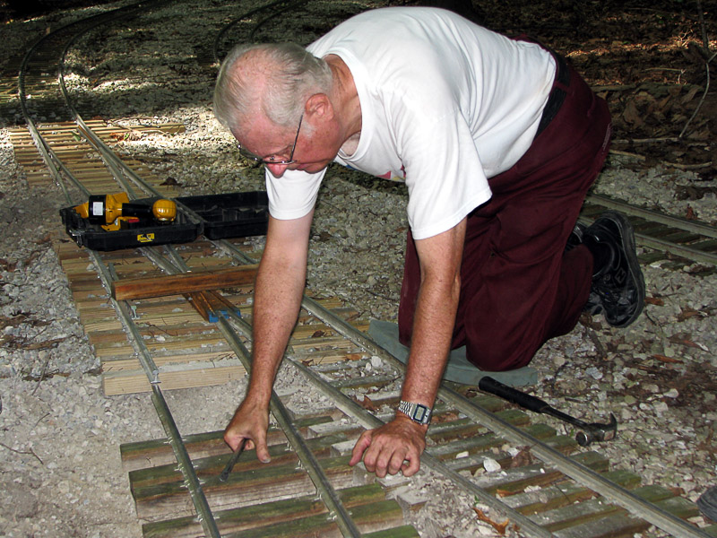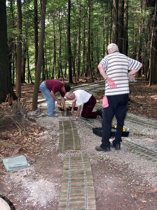 Dick watches as the guys add the missing ties after joining the rail together. At the other end of the track panel they connect another rail joint by bolting the two rails together. |