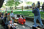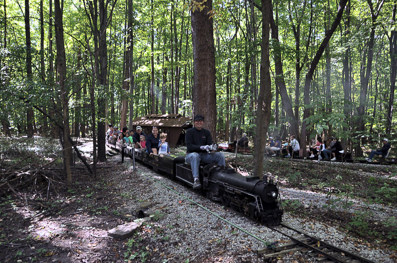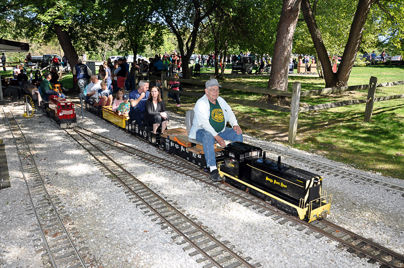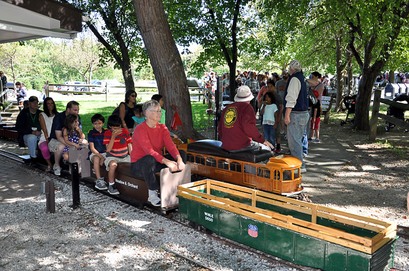 Ken Brooks is our loader today for the public run as Ted Nyland with his pair of interurbans waits to be finished loading. Bill Besselman, seated behind the train, is our passenger counter as Paul Zorko gets his train in motion as he starts his run. |