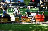 Frank and East Wind, just passed over Festival Bridge as he heads for the station with his passengers as Dick in the background with his train are about to pass thru the Covered Bridge. At least he is all smiles as he enters the curve on the backside of the station. |