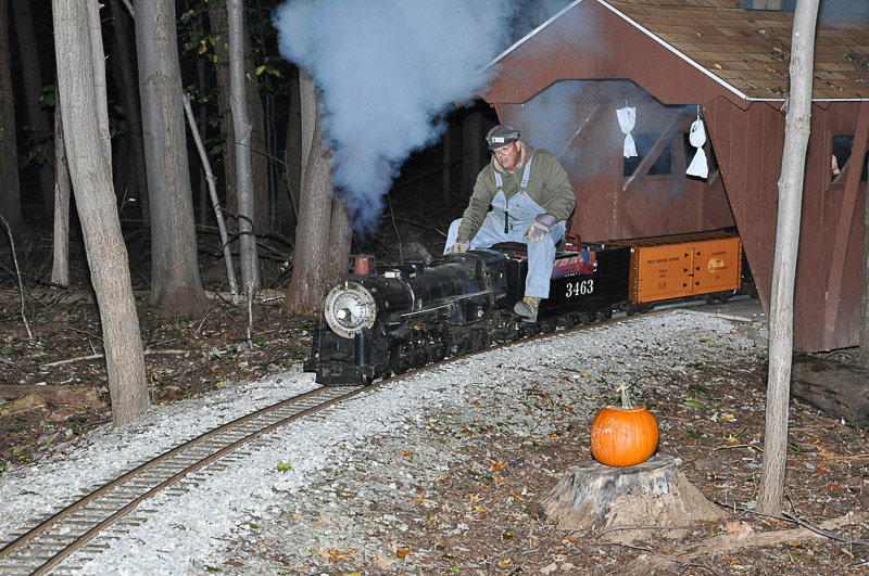 Frank Smoley leaving the station after Ken Brooks just finished riding instructions to the first load of passengers. Today is a night run for the Whooloween celebration at the Park and Dave Woldman starts his run with his RS3 diesel engine. |