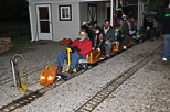 Richard Sales with his decorated pumpkin control car ahead of his power unit that passengers ride on, is leaving the station. John Deptowicz with his Snoopy train starts his run as Sean Roberts on the adjacent track checks over his steamer. |