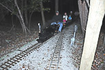Karl Losely seemingly to be coming out of the darkness with his big Hudson steam engine after passing through Zip Junction. Back at Shriver Station John and his conductor Logan Tapolyai wait for Ken to finish loading the train. |