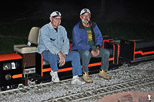 Frank Smoley and Ron Malinowski take a break in between the run times the Park personal has set up into time groups for riding. John Riba waits for riders departing his train to clear the area before moving ahead to the loading area. |