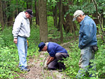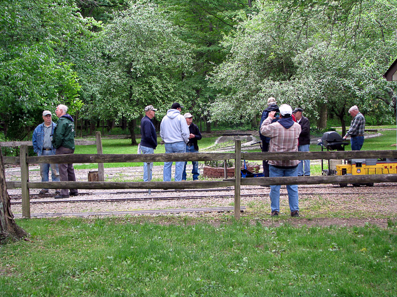 The shifter is one problem and the long reach to adjust the engine rpm is another as John Koontz, Wayne Boron and Frank Smoley look things over. Frank Foti and Dick Clark look over the north track of the Pandora "Y" that needs leveling. |