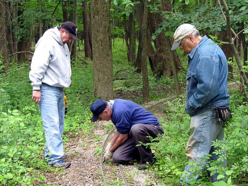 The guys are trying to remove the roadbed down enough that when replacing the track panel it won't be setting on a high spot of ballast. With the existing track panel back in place, Frank and Dick refasten the rail joiners. |