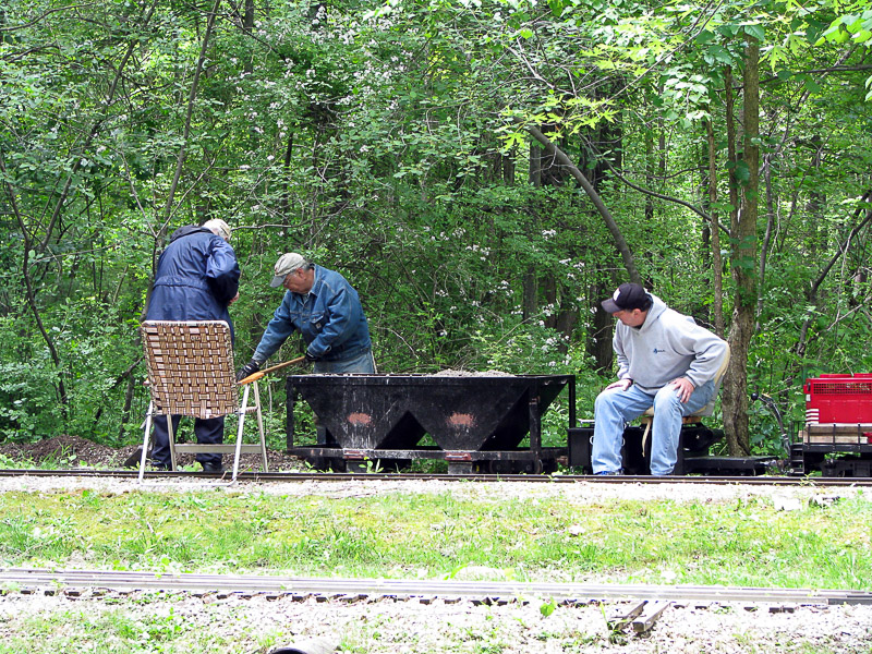 Dick Scott and Frank got the ballast car out and loaded the car, backed into the releveled track panel and shoveled some ballast between the ties to keep from bending the rail. The rear chute gate had been pried open and the train is backing up. |