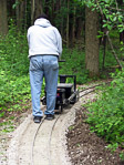 Dick Clark and Dick Scott pry open the gates on both sides now as Frank backs the train down the track. Here you see Frank operating the ballast sweeper to finish up the task. |