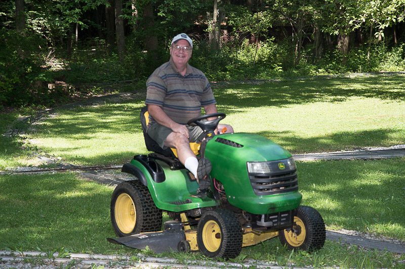 Today is also a regular work session day and Ken Vendlinger is cutting the grass behind Shriver Station. Judson is giving a talk to the group explaining the different railroad cars and some of the type of loads they may carry. |