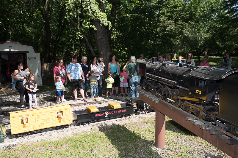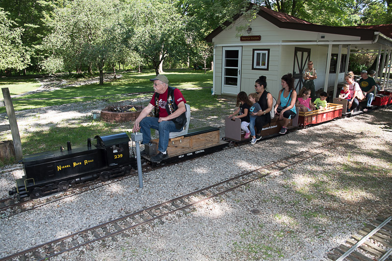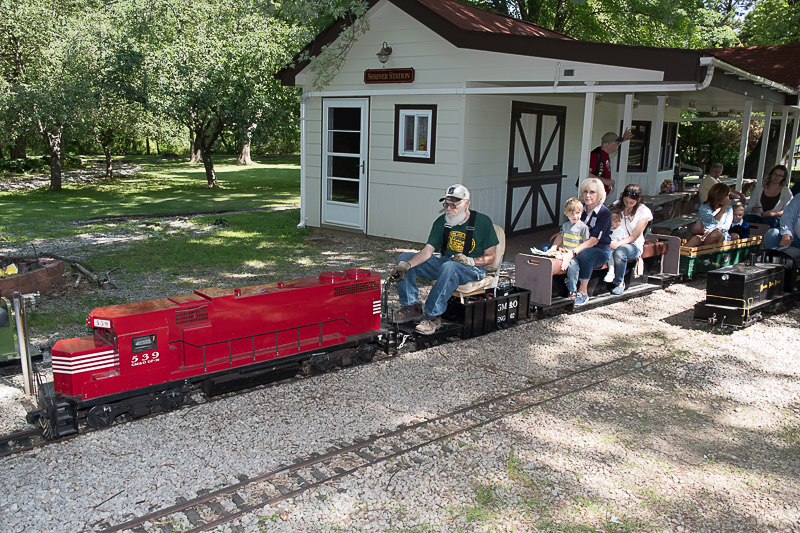 Judson gives the name of the car and asks the kids what they think might be hauled in it or on it(as in the case of the flatcar). John sitting behind his engine waiting for the attendees to come over to the loading area for a ride. |