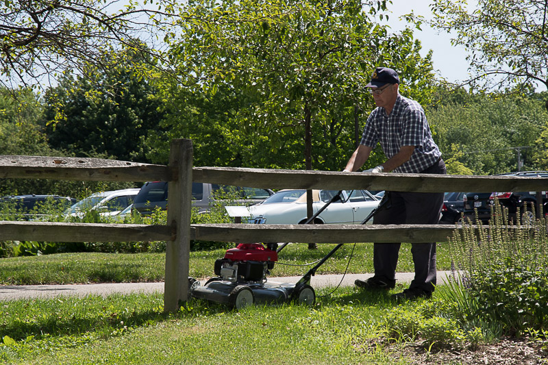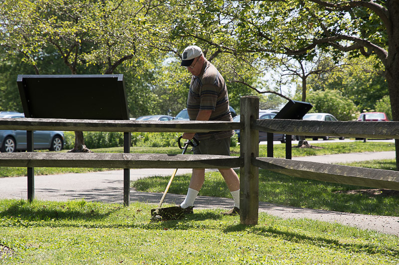 With the 10 o'clock group finished riding we have time till the 1 o'clock shows up so Tom Pappas used the time to cut the grass in front of the station. Ken using the wheed whip to cut the grass the mower couldn't reach. |