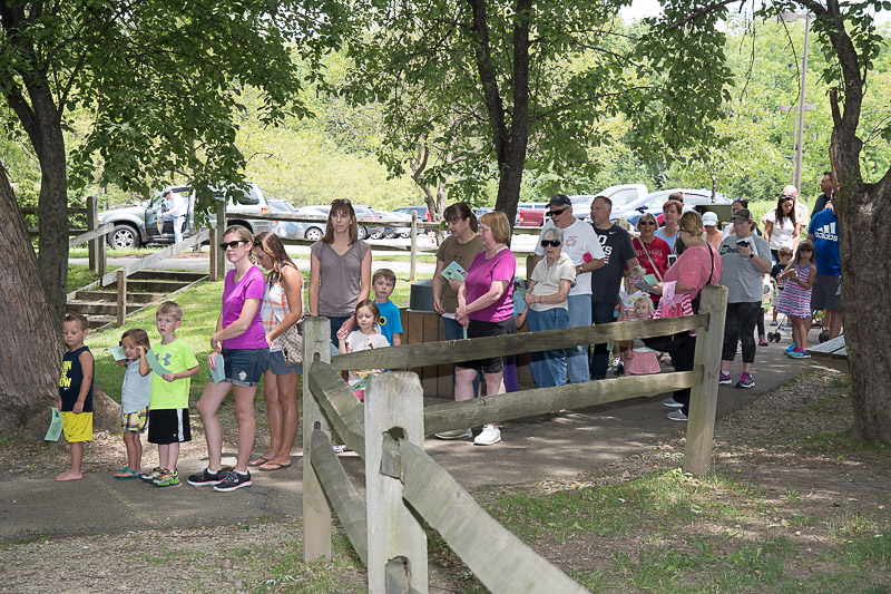 A gondola of children with tickets in hand as they leave the station riding the train. Ken waits while a mother takes a picture of her child getting his riding ticket punched by Park personal. |