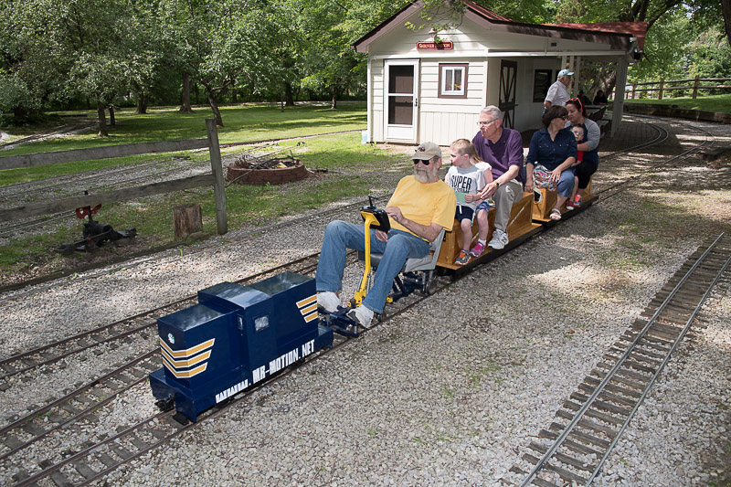 A view of the riders on Judson's train as they depart the station and Paul Emch with the train on the adjacent track being loaded. We have some smiling passengers on Paul's train as they leave the station. |