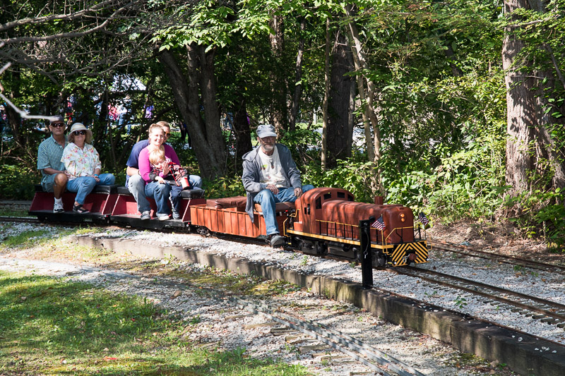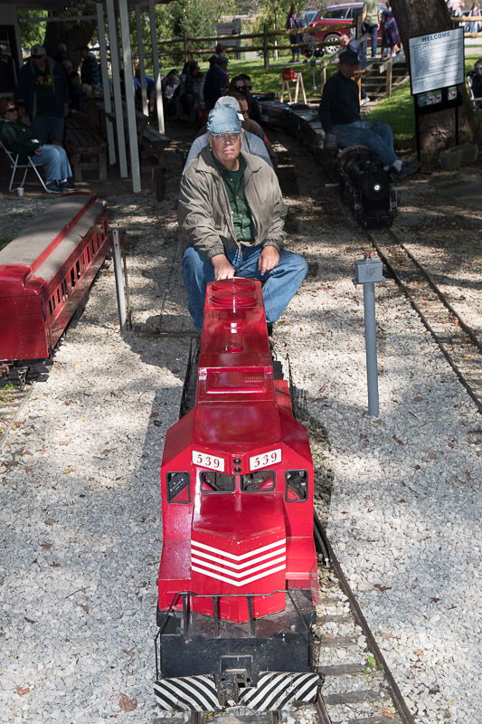 Judson puts the train in motion after taking on his passengers and heads down the mainline. Kenny is all smiles as he starts another run with the Reading switcher engine and trainload of passengers. |
