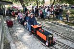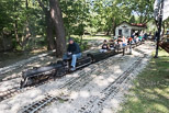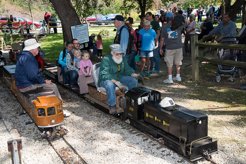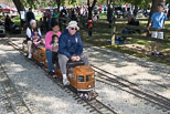 Today is Bug Day at the Park as members finish eating lunch prior to the start of the run. Ted Nyland with his pair of interurbans takes one of the first loads of passengers at the start of the run. |