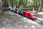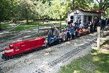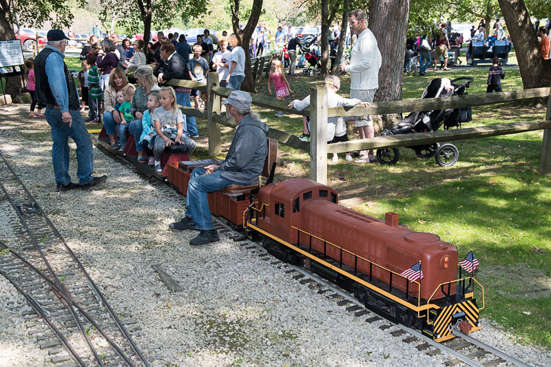 Ted waits to be loaded with riders after Judson Elliott with the club's switcher, leaves the station. John Deptowicz and his Snoopy train passes by Pandora as he heads for Shoe and the Covered Bridge. |