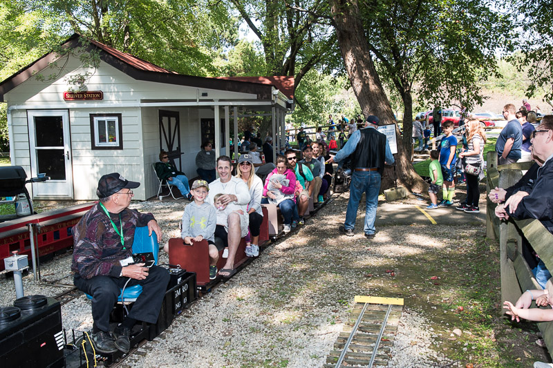 John Riba with his GP9 puts his train in motion with Dennis Crislip as his conductor riding on the last car. Ron Malinowski departs Shriver Station with his trainload of passeengers after Ken Brooks, our loader, gave him the "All Aboard!" call. |