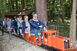 Bill Deptowicz at the controls of the Snoopy Train giving his son a break and a chance to stretch his legs. John waits for Ken to finish his talk before he can start his next run with his full load of passengers. |