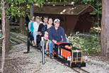 Dave Woldman adjusts the speed of his engine to get his train moving after taking on a load of riders. Ken finishes rider instruction as Frank Smoley waits for the departure call. |
