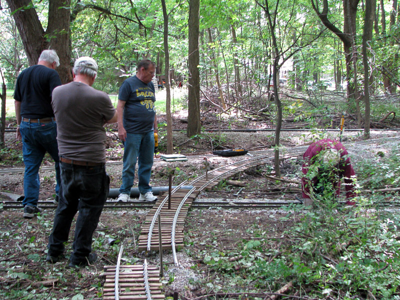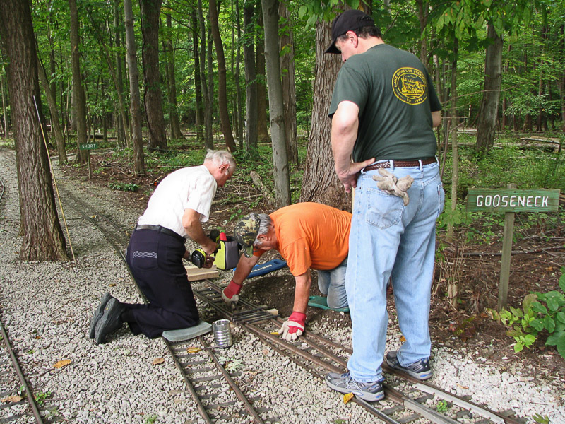 Recently we had a couple of trains that derailed when backing into the Ochard Yard, so Ron Trenhaile, Dick Scott and Frank Foti checked out the switch points. They replaced a couple of ties and added shims to the point rail. |