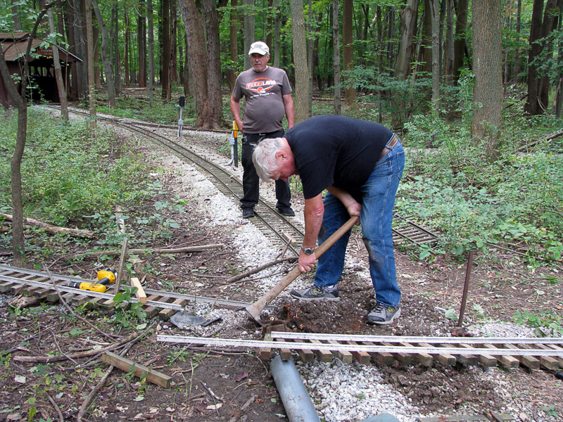 With points shimmed, Dick got a wheelborrow of ballast and dumped it as Ron tamped the ballaast between the ties. Frank and Ron checked the gauge and refastened the rail to bring it up to specs. |