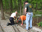 After running a train through, Dick and John Reba took on the task of bending the switch point so a wheel flange wouldn't pick the switch point. Dick Clark is checking the rail gauge through the switch points. |