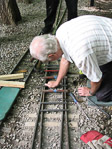 A picture of Dick just relaxing after he had taken the rail joiners off the track panel so we could remove the panel. John completes the task and takes a breather, you can see the stump pieces lying around. |
