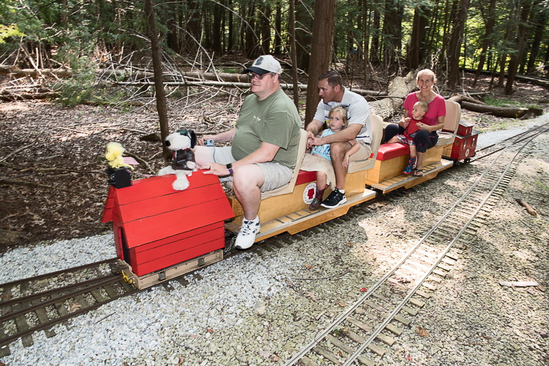With his trainload of passengers, John Koontz prepares to depart Shriver Station as John Deptowicz waits for Roy Harris to load his train. Snoopy leaving the station with a family riding behind John all being lead by Woodstock. |