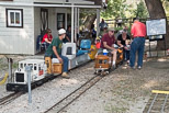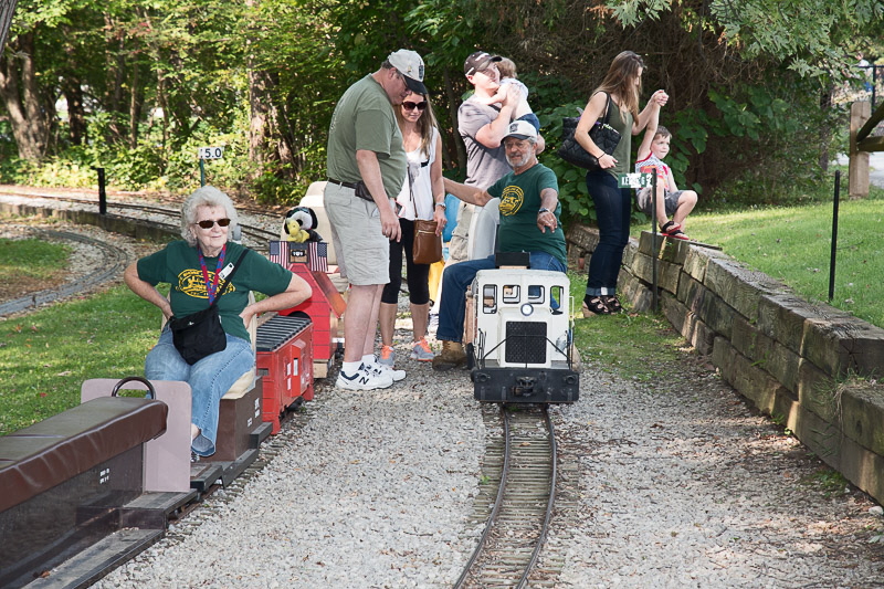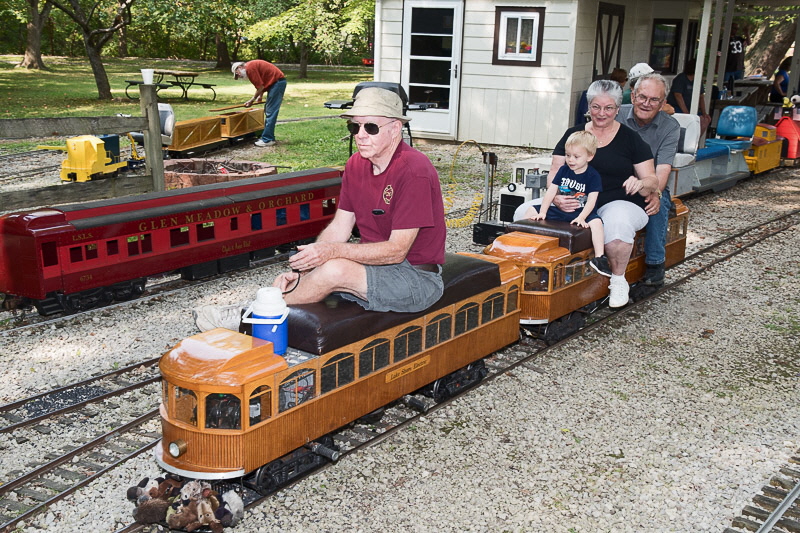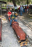 As Roy loads a youngster in the gondola of Paul Emch's train, Mike Harkleroad passes thru riding on a Fire Ball Express riding car. The young girl decided to ride with mom and Paul has put the NKP Hudson in motion. |