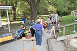 Lois waits for the train to move to the loading area with John talking to Ron as his riders unload. John and Ron move their trains forward to load riders as Linda watches the next train approaching the unloading area. |