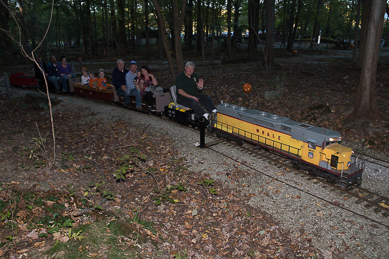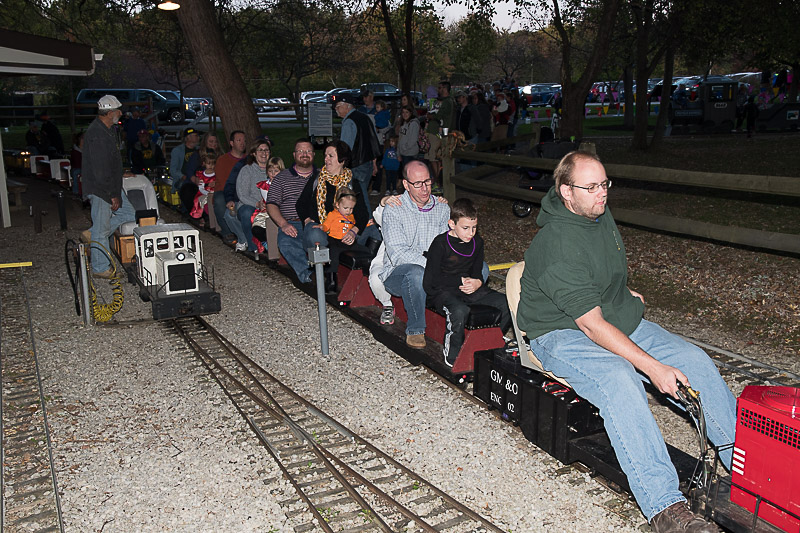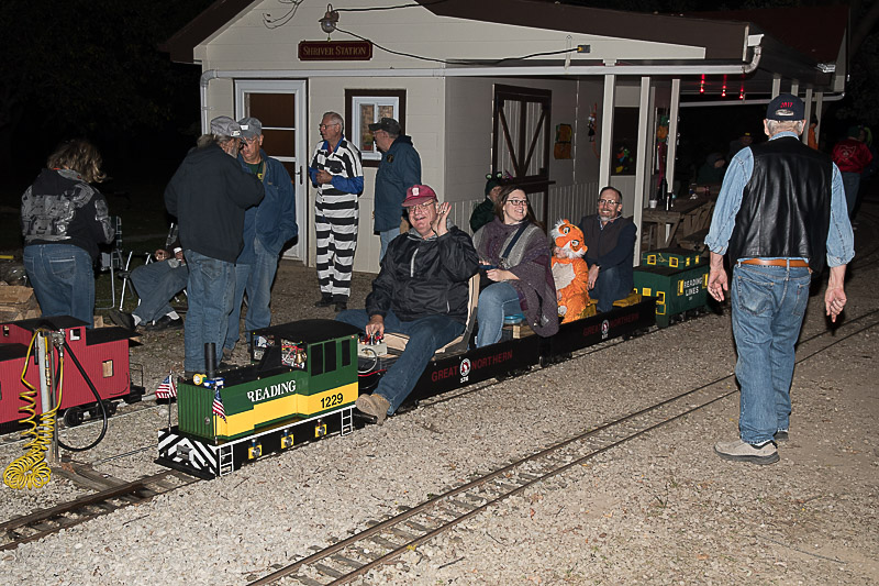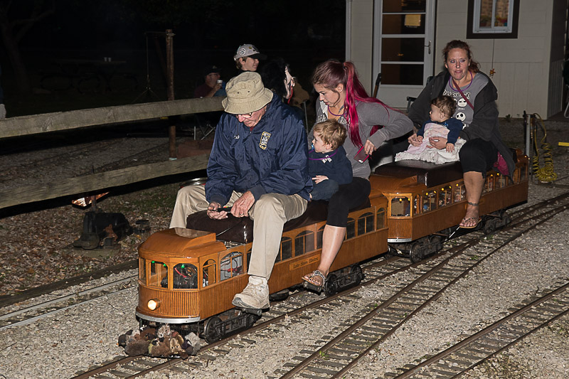 Dick's passengers are smiling as the train gains some speed and that's Steve Zaken riding on the rear car as conductor. Dave Woldman must have been to Walmarts for this mask for Holloween. |